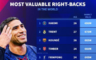 德转列右后卫身价榜:阿什拉夫8000万欧居首,阿诺德第二